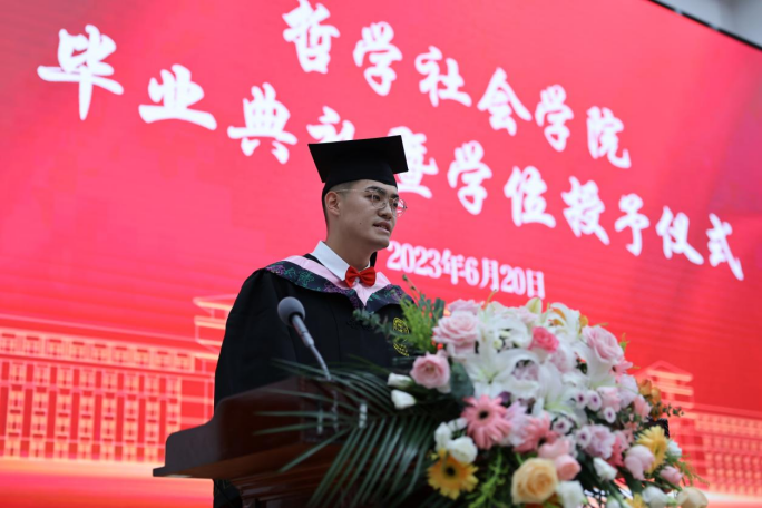 典礼第七项,学院毕业研究生代表,2023年度best365官方中文网页版登录十佳研究生、2020级马克思主义哲学专业博士研究生高天驹同学发言。高天驹同学将best365官网“为人治学,其道一也”的优良传统融入日常钻研奋斗,向在场的师生们讲到,吉大之大,大在一代代吉大人有“温度”,讲情怀,为学严谨,以德育人,凛然正气,洒脱通达;有“厚度”,敢担当,“哲思群理,修齐治平”的学院精神激励着一代又一代哲社人为“更多人的幸福”打开可能性的空间;有“深度”,重学识,在这一段宝贵又难忘的求学生涯中,每一个有限的“自我”都向着无限的知识不懈求索。