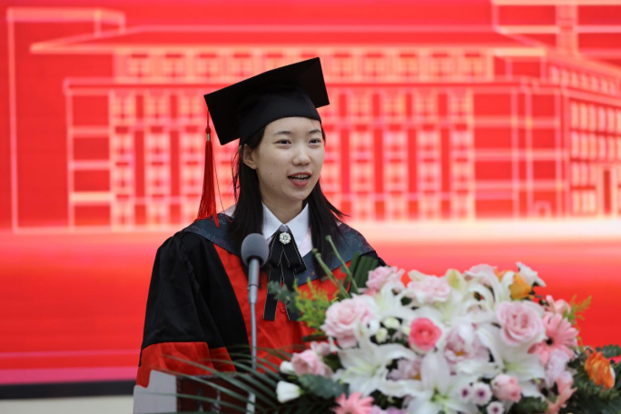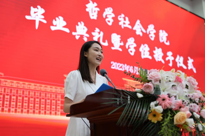 典礼第九项,学院在校生代表,2022年度吉林省优秀学生干部、2022级劳动与社会保障专业李慧婷同学发言。她回望几年来,我们短暂交错,而今尾声潮落;回望曾经,那些回忆被你我藏于内心,弥足珍重。如今虽然各自奔赴海北天南,在这个蝉鸣不止的夏天,你们安静地回头朝那个装满故事的门说再见,也一定能够再见。她代表师弟师妹们祝福全体毕业生师兄师姐们,“此后跃入人海,各有风雨灿烂”!