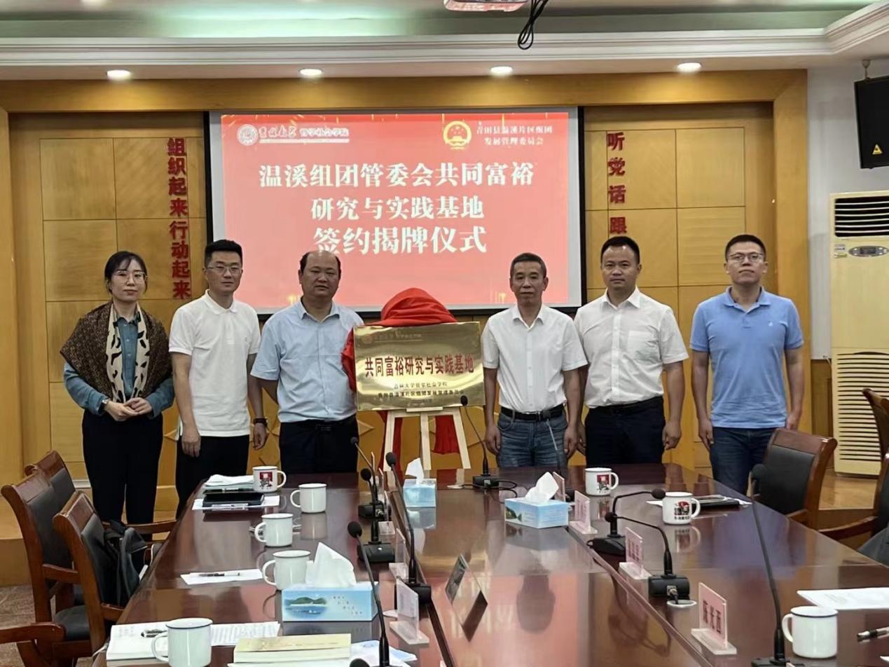6月29日,学院与“青田县温溪片区组团发展管理委员会”(简称温溪组团管委会)共同签署合作备忘录,best365官方中文网页版登录“共同富裕研究与实践基地”正式落地温溪镇,双方将携手共同探索实现小城市发展带动周边乡村实现共同富裕发展路径。青田县委常委、温溪组团管委会主任、温溪镇党委书记童森军主持仪式。学院副院长芦恒教授、温溪组团管委会常务副主任陈光西分别代表双方签订基地合作备忘录。学院党委副书记兼副院长刘培强、温溪组团管委会主任童森军共同为共同富裕研究与实践基地揭牌。