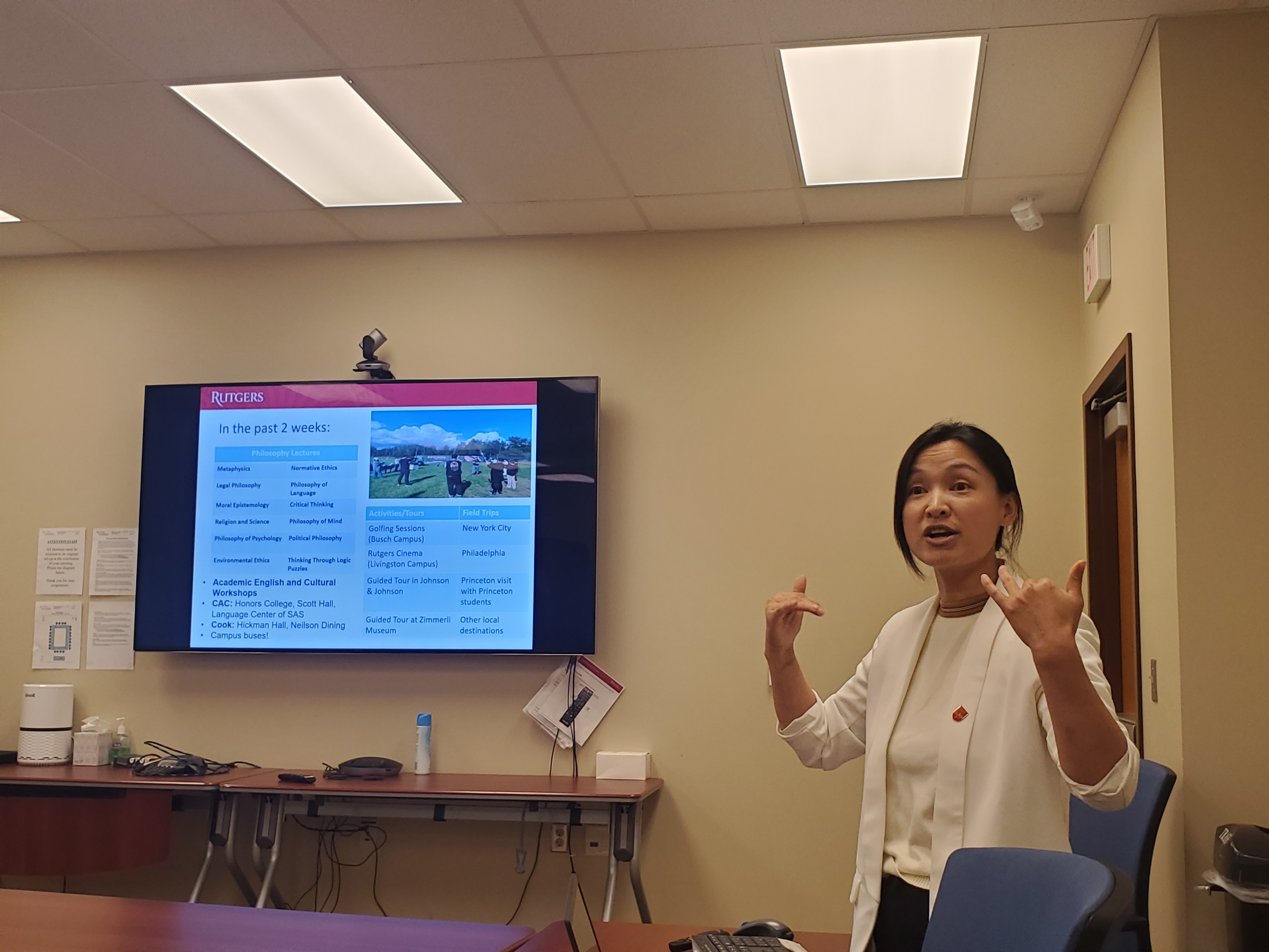 课程结束后,同学们对于在罗格斯大学两周的交流学习阐发了自己的感受。同学们分享结束后,外方举行了交流访学的结束仪式。首先,Shuman Wen老师对于两周的交流生活进行了总结,并以短视频的形式对两周的学习进行了回顾。