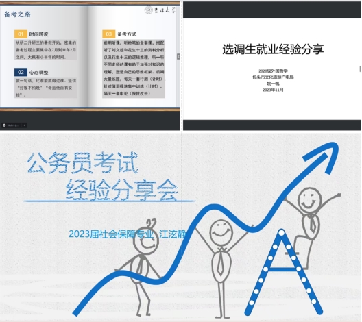 此次活动邀请了仵逸鋆、姚一帆、江泫静等三名2023届优秀硕士毕业生,他们分别来自不同专业,通过各省市选调考试成功上岸,就业岗位覆盖河北省沧州市选调、内蒙古自治区包头市选调、广东省珠海市选调。