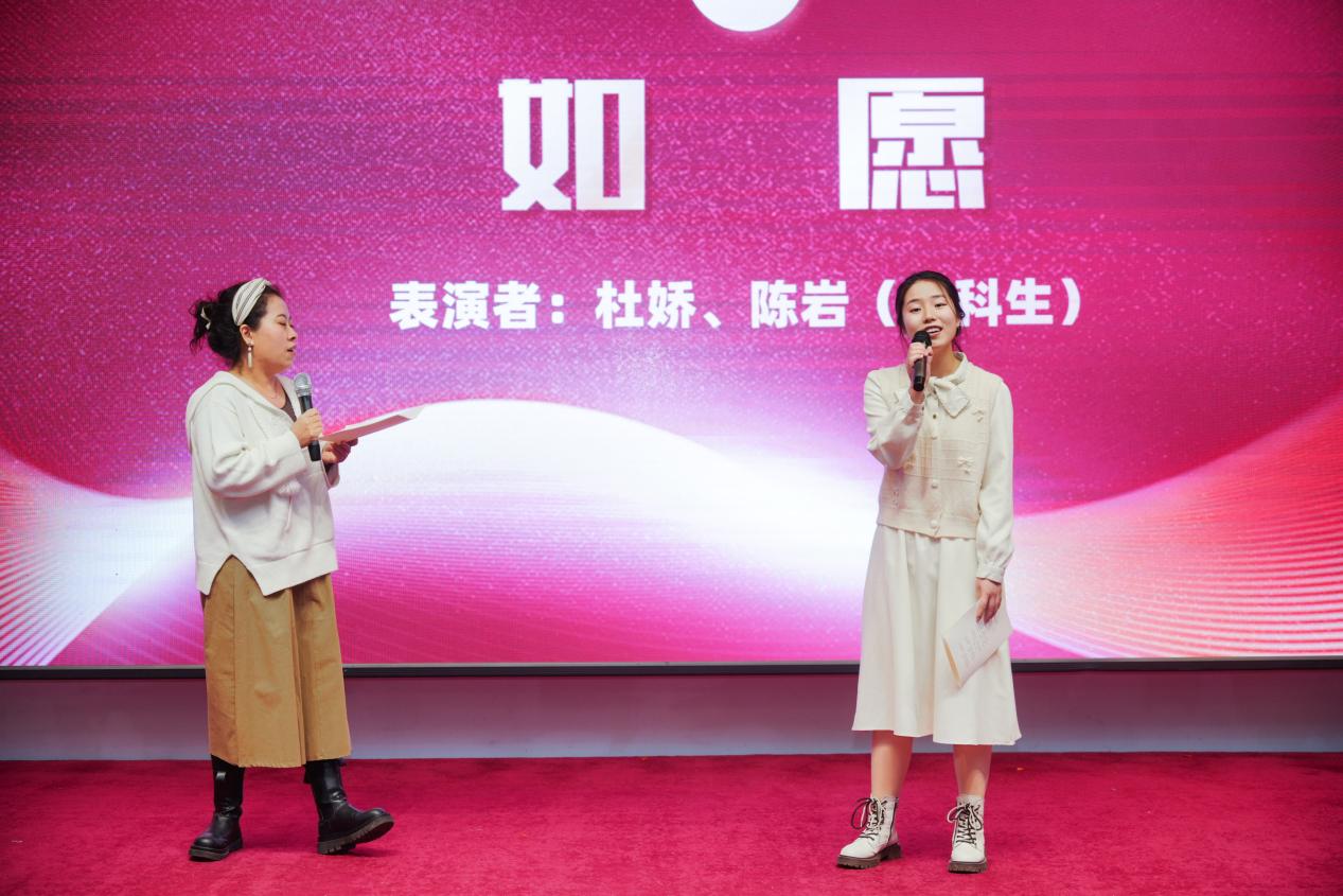 “山河无恙,烟火寻常,可是你如愿的眺望?”一个问句,将时间线拉回新中国成立之际。我们的祖国,苦过,贫过;我们的祖辈,累过,拼过。可正是这样的艰难过往,似明月清风,照拂我们的梦。杜娇老师与陈岩同学(本科生)共同唱响《如愿》,舒缓的曲风让我们忆起新中国的峥嵘岁月。再次唱响此首歌,许未来如愿。