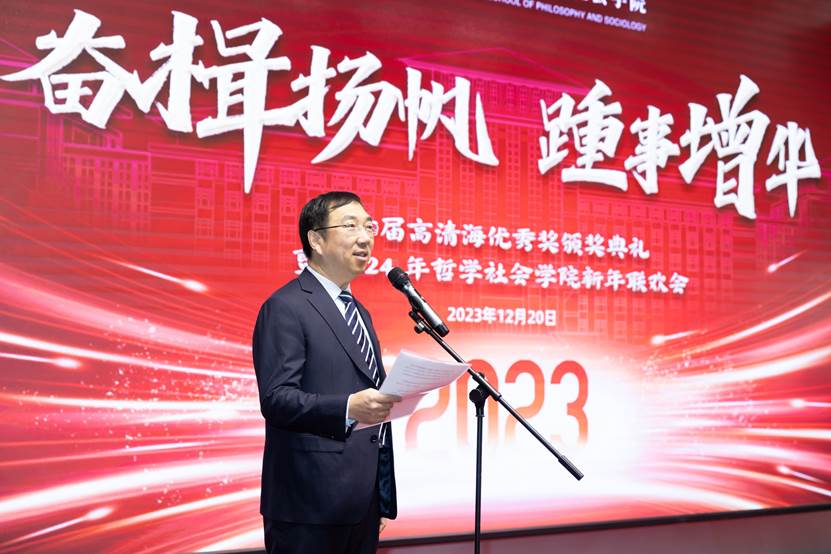 然后,党委书记张晓萌发表讲话。张书记围绕成就、发展和团结三个主题,回顾总结了在高清海先生的思想精神感召、孙正聿老师的学术旗帜辉映、学院党委的政治组织引领下,2023年学院建设发展所取得的突出成就,并对为学院发展作出贡献的每一位师生表示了深深的敬意与感谢。同时,张书记向学院全体师生表达了诚挚祝愿与真心祝福,并希望全院师生能够接续前行、团结奋斗,将学院发展推向一个新的高度。