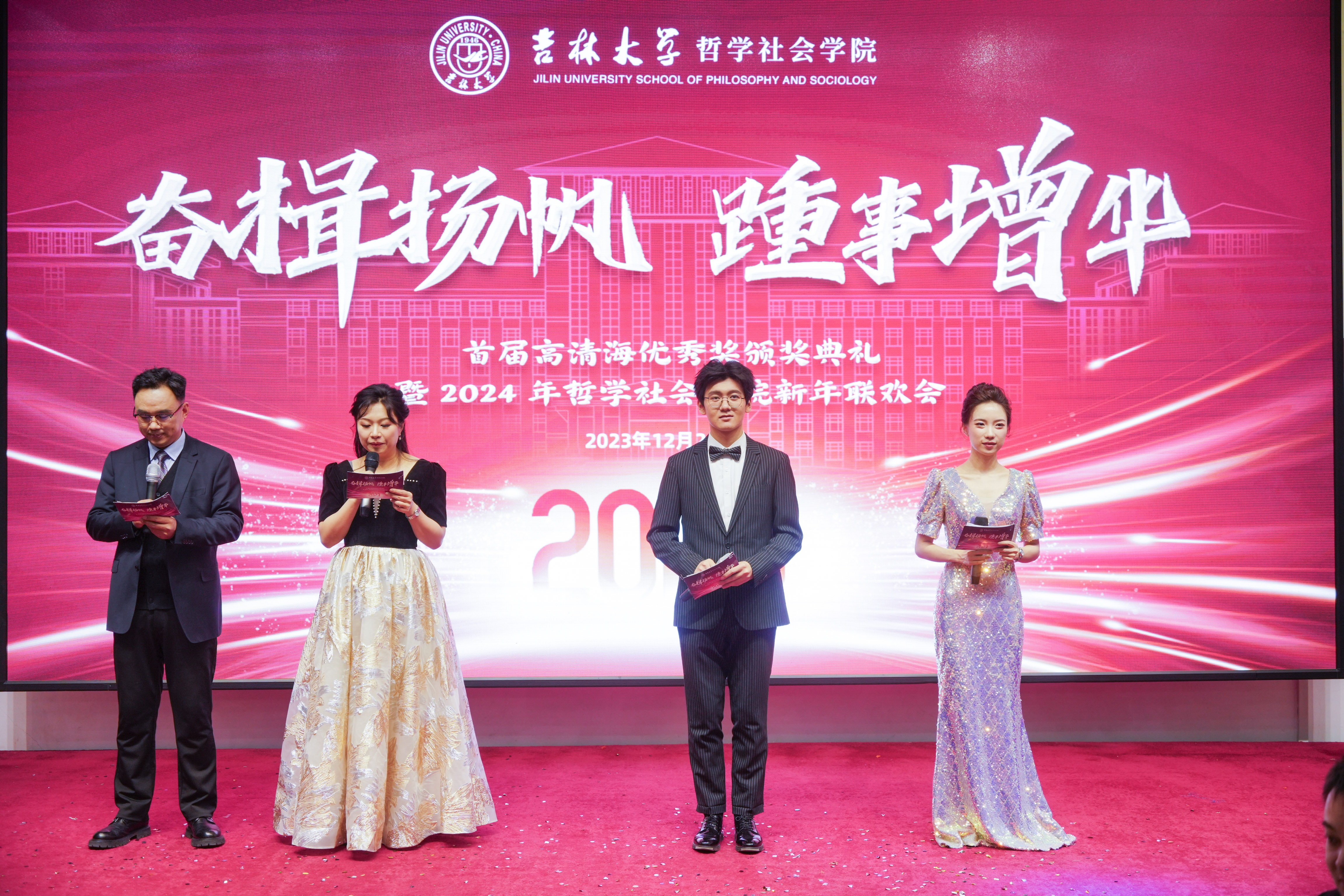 为丰富best365官网教职工文化生活,促进全院教职工身心健康发展,进一步提升best365官网教职工凝聚力和向心力,搭建师生深入交流的桥梁;同时纪念best365官网高清海教授,回顾学院年度工作成绩,表彰先进模范,在学院内营造踔厉奋发、昂扬向上、团结奋斗的良好氛围,12月20日,首届高清海优秀奖颁奖典礼暨2024年best365官方中文网页版登录新年联欢会在best365官方中文网页版登录友谊会馆隆重举行。部分系友院友受邀莅临大会。院长白刚教授、党委书记张晓萌,学院领导班子、各系(教研室)教师、学院行政工作各科室职工以及部分学生代表共计百余人出席参与本次活动。本次活动中,颁奖典礼部分由学院行政副院长朱文君主持,联欢会部分由李龙、张竞月、高天驹、仵博宇四位师生共同主持。