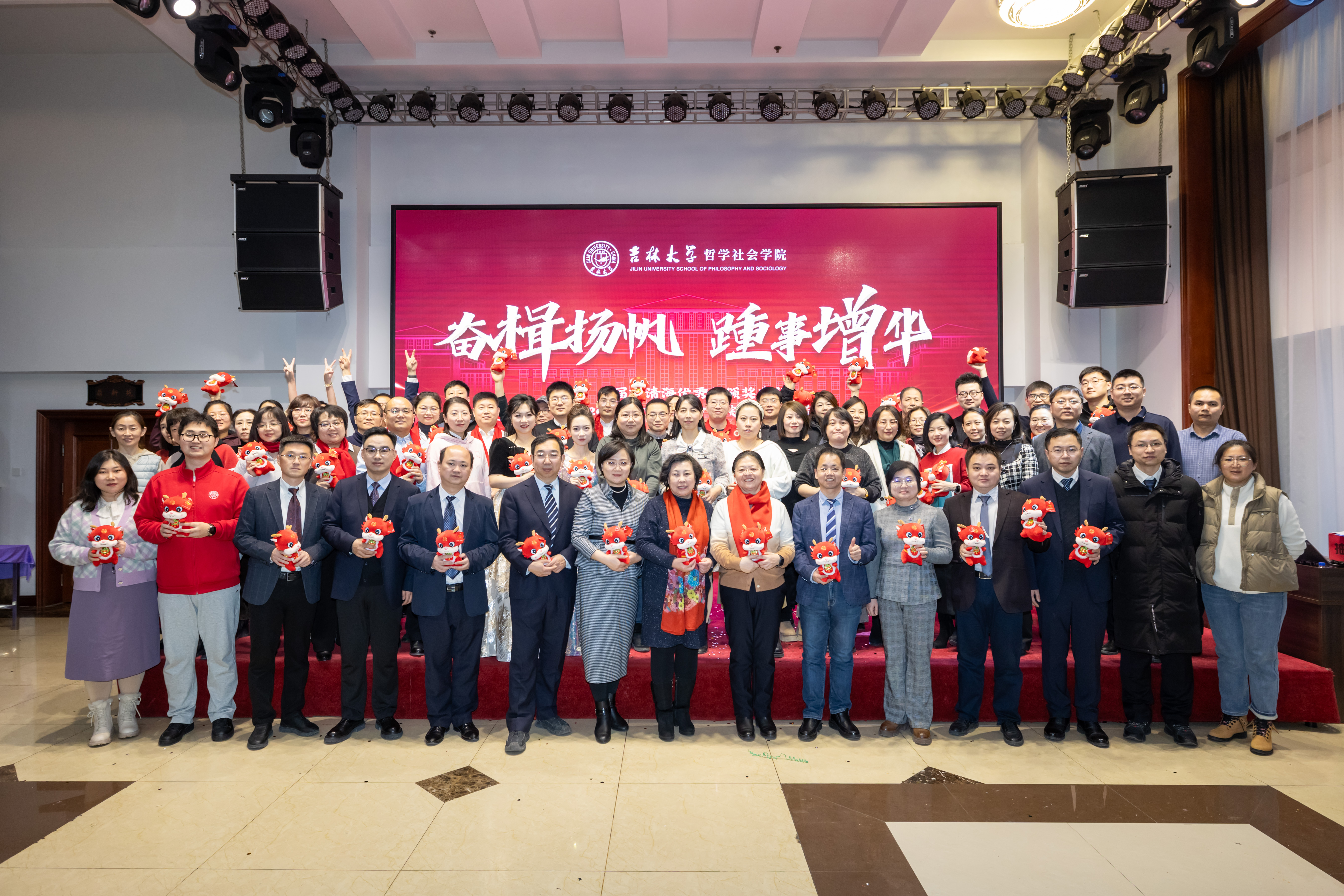 相遇相逢,三尺讲台赤忱依旧;相知相守,深耕不辍运思未歇。三寸粉笔三千桃李,一片丹心一生铸魂。裁下一缕月光,我们共赏韶华依旧;寄蕴一抹哲思,我们同念天下治平。胸怀宏伟蓝图,过往皆为序章;磨砺正当其时,逐梦赓续奋斗。愿以本次教职工联欢会为契机,哲社教职工大家庭将继续团结奋斗、求真讲理、擎灯前行,为党的教育事业发展做出属于哲社人的新的更大贡献!