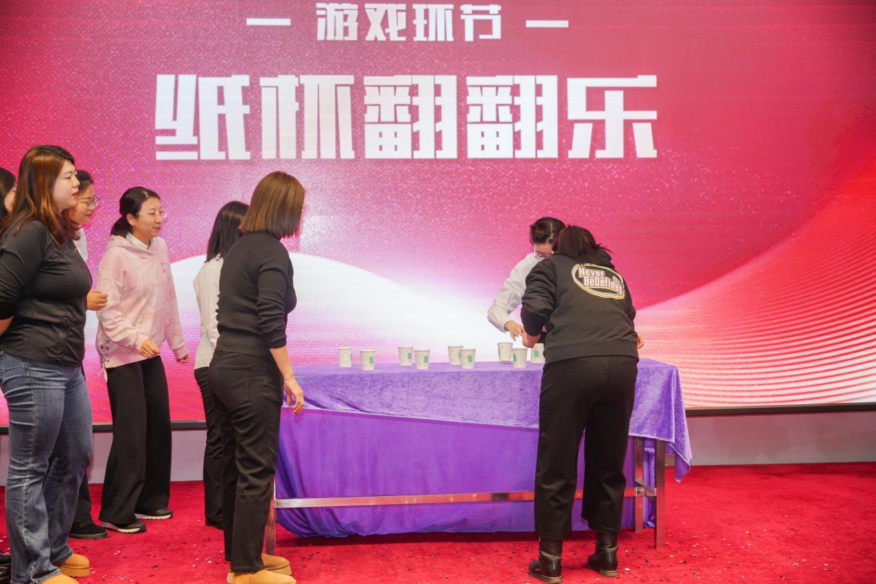 在全场热烈的掌声中,我们进入本次联欢会的重头游戏——“纸杯翻翻乐”。教职工们紧盯着纸杯,默数着时间,全神贯注、屏息敛气,在这样一场速度和默契的比拼中,大家拼出风采、拼出欢乐!