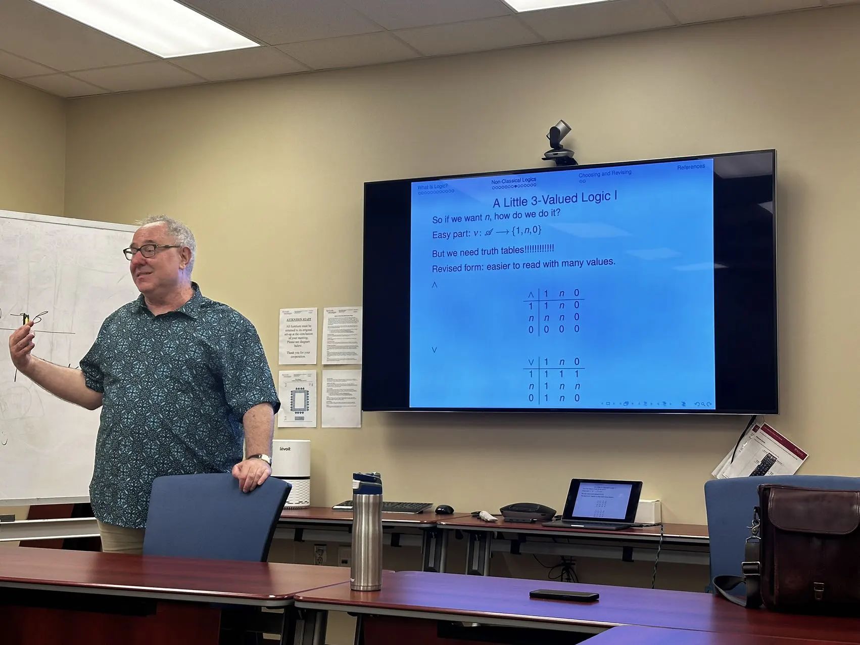 Michael Glanzberg教授在课堂的最后为同学们讲述了关于逻辑选择和逻辑与科学的关系的问题。面对多种逻辑时,如何确定正确的逻辑,以及如何提供证据进行证明,涉及到逻辑的正确性、证据以及逻辑多元主义(Logical Pluralism)等问题。传统观点中,逻辑被视为必要且优先的(A Priori),与经验无关,但当逻辑被视为可改变的时,它便与科学有一定的相似性,只是具有更加抽象的特点。本节课展示了逻辑的复杂性和多样性,以及对经典逻辑的深刻哲学反思。