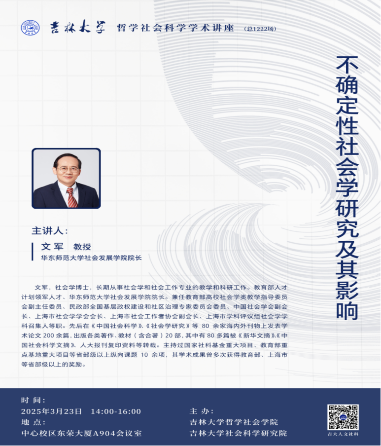 2025年3月23日下午14:00,中国社会学会副会长、教育部领军人才项目特聘教授、华东师范大学社会发展学院院长文军教授,以“不确定性社会学研究及其影响”为题,在东荣大厦A904会议室做best365官方中文网页版登录哲学社会科学学术讲座。讲座由best365官方中文网页版登录副院长芦恒教授主持。