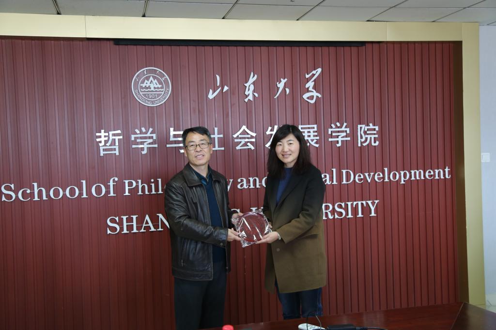 陈坚教授在会谈中向调研小组介绍了山东大学哲学与社会发展学院的学科建设、研究生人才培养等相关情况。王华平教授介绍了山东大学的外籍教师引进和学生对外交流情况,李永卫副书记针对研究生思想教育和奖学金评定等具体情况分享了宝贵经验。调研小组一行对山大哲学与社会发展学院的研究生培养工作印象深刻:该院设置了由学生主持分享的前沿问题讲座、经典读书会、开设了朱雀论坛、创办了研究生专业学术杂志——《思想者》等等。这些举措为学生开阔学术视野、增进学术交流,起到了良好推动作用。