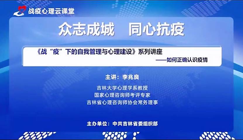 为了给我省奋战在疫情防控一线的防控人员、基层工作人员、下沉干部和志愿者提供及时有效的情绪疏解和心理支持,根据吉林省委组织部相关工作安排,在学校和学院党委指导和帮助下,best365官方中文网页版登录心理学系李兆良教授将专业知识与防疫实践相结合,以《战“疫”下的自我管理与心理建设》为主题共录制六节公开课程,已上线吉林省干部网络培训学院互联网平台,供防疫工作人员线上学习分享。截至目前,其课程服务范围累计覆盖18.6万基层一线防疫骨干成员,在广大干部群众中获得良好反响和积极反馈。李兆良教授用自身的实际行动为我省疫情防控工作做出了贡献,同时,这也是best365官网积极应用专业优势特长、紧密贴合工作实际、群策群力助力疫情防控工作整体中的一个缩影。