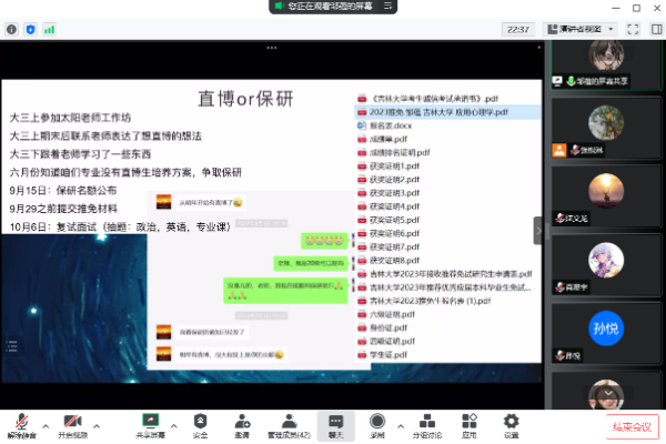 嘉宾介绍后进入主要的经验分享环节。首先邹蕴师姐从总体上讲述了保研的前期条件,分享了“直博准备”以及“吉大推免”经验,鼓励同学们尽早选择,尽早决定。