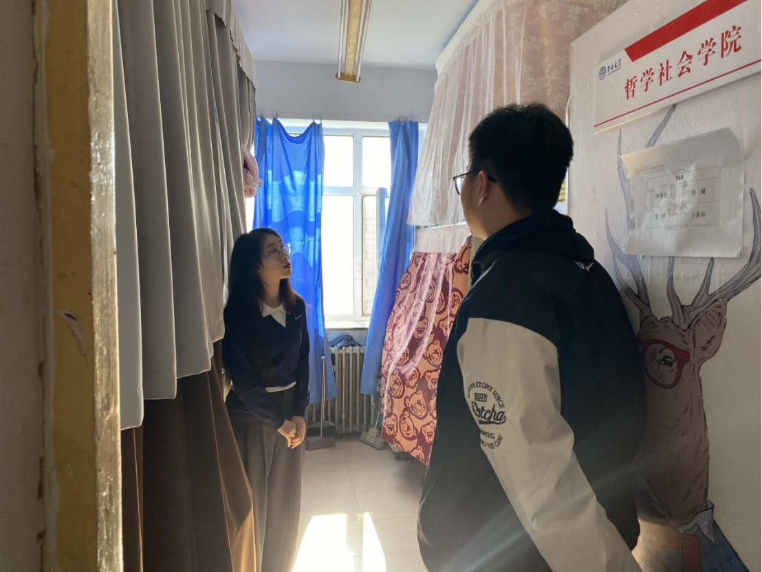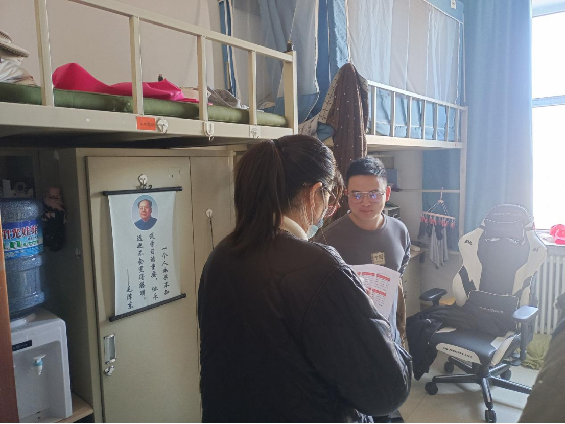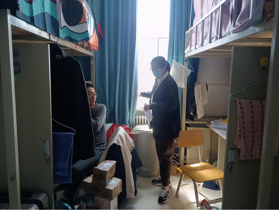 来到寝室中,工作队首先针对同学们寝室中存在的卫生问题提出了清理建议,提醒同学们“个人是健康的第一责任人”,整洁良好的居住环境既有助于同学们的身体健康,也有助于心情愉悦。与此同时,同学们要持续加强个人防护,如出现疑似症状,要及时上报并前往校医院或社会医疗机构就医。