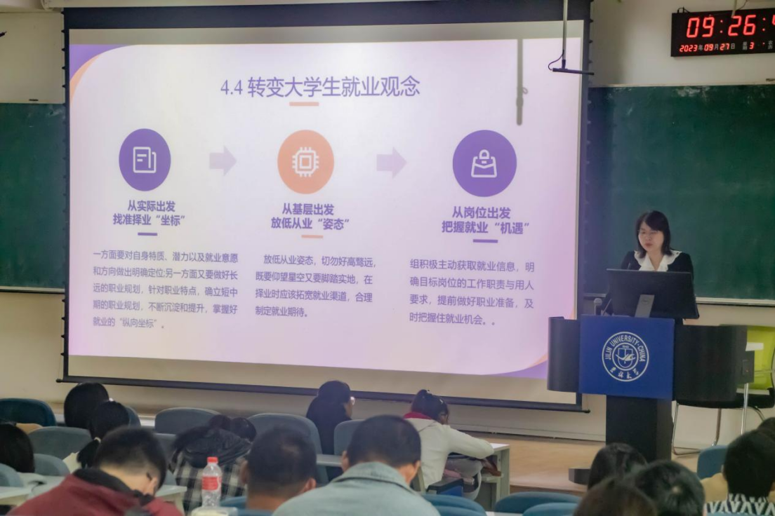 最后,冯老师从学校和学生两个角度为同学们介绍了就业前准备工作。冯老师从促进就业指导措施和指导服务、加强与企业的合作和打通线上与线下求职渠道等方面提到学校高度重视同学们的就业质量,科学谋划、细致摸排,为同学们的个人发展保驾护航。同时,冯老师勉励同学们从实际出发,找准择业“坐标”,充分挖掘自身优势、积极探索生涯规划;从基层出发,放低从业“姿态”,广泛拓宽就业渠道、合理制定就业期待;从岗位出发,把握就业“机遇”,主动明确目标岗位、提前做好职业准备,及时把握就业机会。