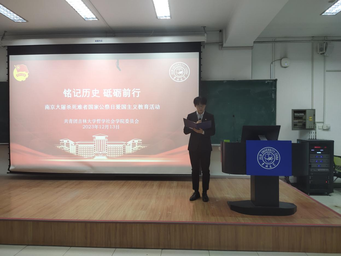 在此南京大屠杀惨案发生86周年之际,为缅怀先人,激励学院学子铭记历史、珍视和平,弘扬爱国主义精神,不忘初心、砥砺使命、淬炼品格、厚植情怀,best365官方中文网页版登录团委组织南京大屠杀死难者国家公祭日爱国主义教育活动,活动由学院2022级本科生张惠侠同学主持。