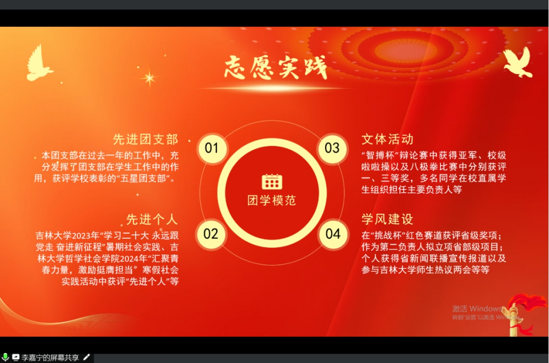 学院2022级1班团支部书记李嘉宁,围绕团支部思想建设、组织建设、团支部志愿活动以及团学模范四个方面回顾了一年来团支部的成长历程,展示了团支部成员的饱满的热情与务实的态度。