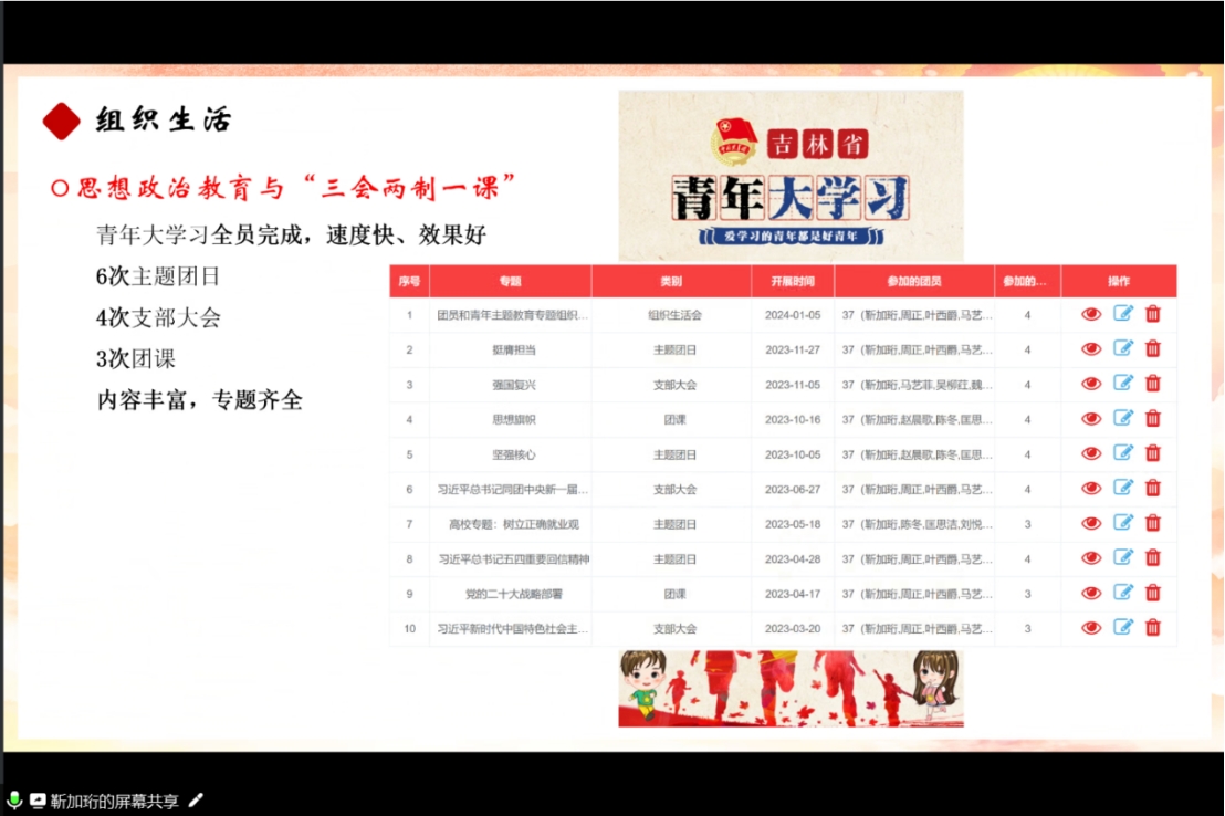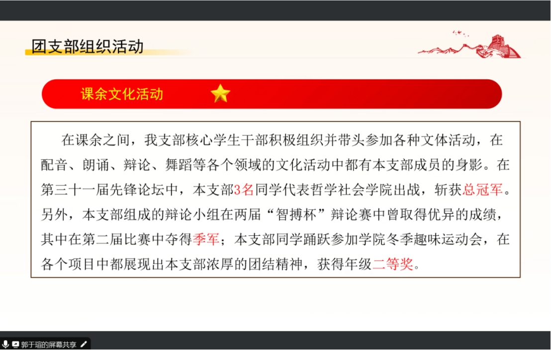 学院2022级2班团支部书记靳加珩,从支部情况、团员日常管理、团支部思想教育、作用发挥以及未来展望五个方面进行了汇报答辩,总结了过去一年中团支部存在的一些不足,并对未来一年团支部工作进行了规划介绍。