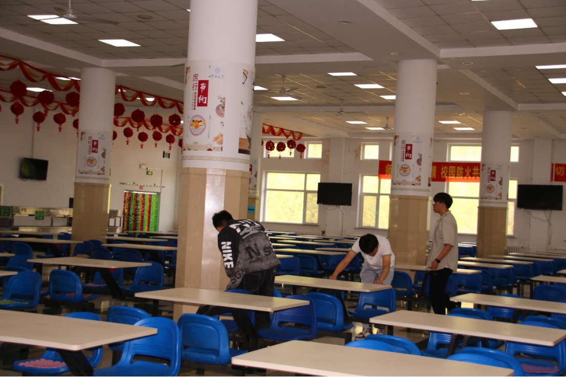 在活动负责人的带领下,同学们分工明确,有序进行卫生清扫。同学们手持工具,仔细清理纸屑垃圾,耐心擦拭灰尘污渍,同时对用餐桌椅进行整齐排列,并在座椅上摆放好干净的坐垫。