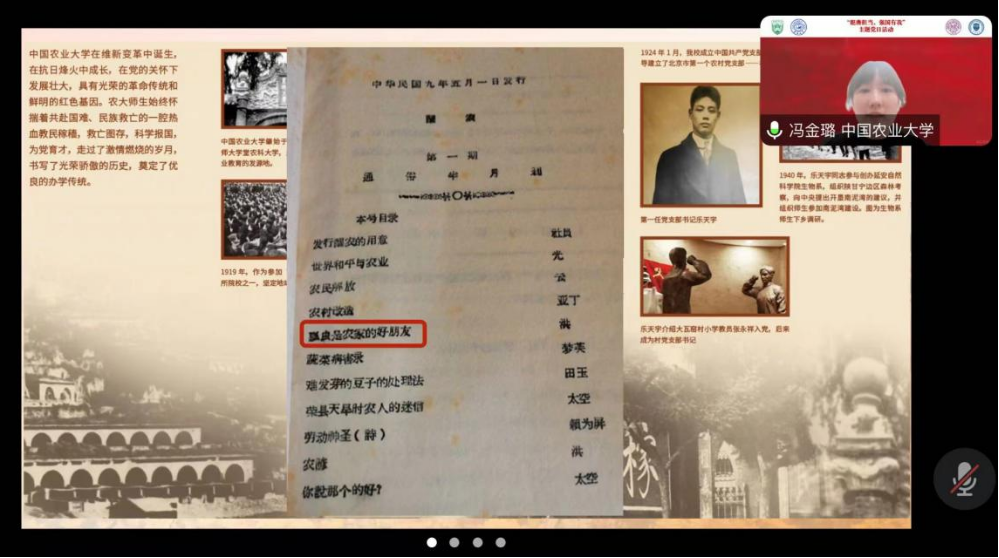 本次活动由全国青马工程学员、best365官方中文网页版登录2020级本科生李慧婷主持,中国农业大学党委理论学习宣讲团博士分团第四届团长、第五届党支部书记冯金璐进行理论宣讲,来自三地四校的学生党员、共青团员们进行心得分享,best365官方中文网页版登录本科生党支部书记、团委负责人宋绍伟老师做总结发言。