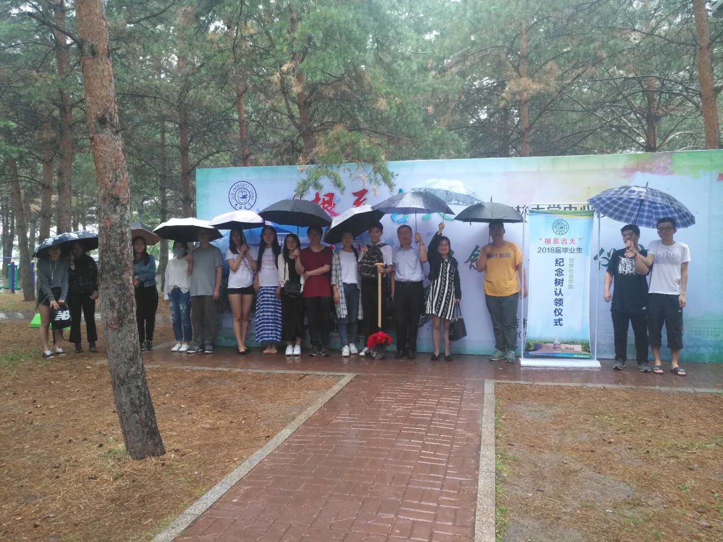 纪念林栽种完毕,由全华书记致辞,他指出,今天这片属于2018届毕业生的纪念林,种下的是你们对母校的怀念和母校对你们的守望,延续的是你们对母校深深的热爱和母校对你们浓浓的不舍。他接着动情地说,虽然今天的仪式在雨中进行,雨都是惆怅的,也正如我们这些毕业生即将离开母校的那种惆怅心情,希望大家能记住今天这个淋雨植树的有意义的时刻,在未来能够打造出属于自己的一片天空。致辞在一片热烈的掌声中结束,最后大家在纪念林前合影留念。