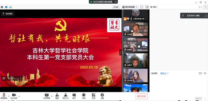 最后一部分主题为“团结抗疫,众志成城”。首先,由19级本科生刘奔腾同志宣读致本科生第一党支部全体党员的倡议书,号召全体党员同志坚定信念,砥砺奋进,积极投身抗击疫情的战斗中去,让青春在祖国和人民最需要的地方绽放。然后,由支部书记刘畅同志进行大会总结发言,刘畅同志高度赞扬了第一党支部党员同志开展的志愿服务活动,叮嘱各位同志一定做好防护,注意安全,用实际行动发挥党员模范带头作用。