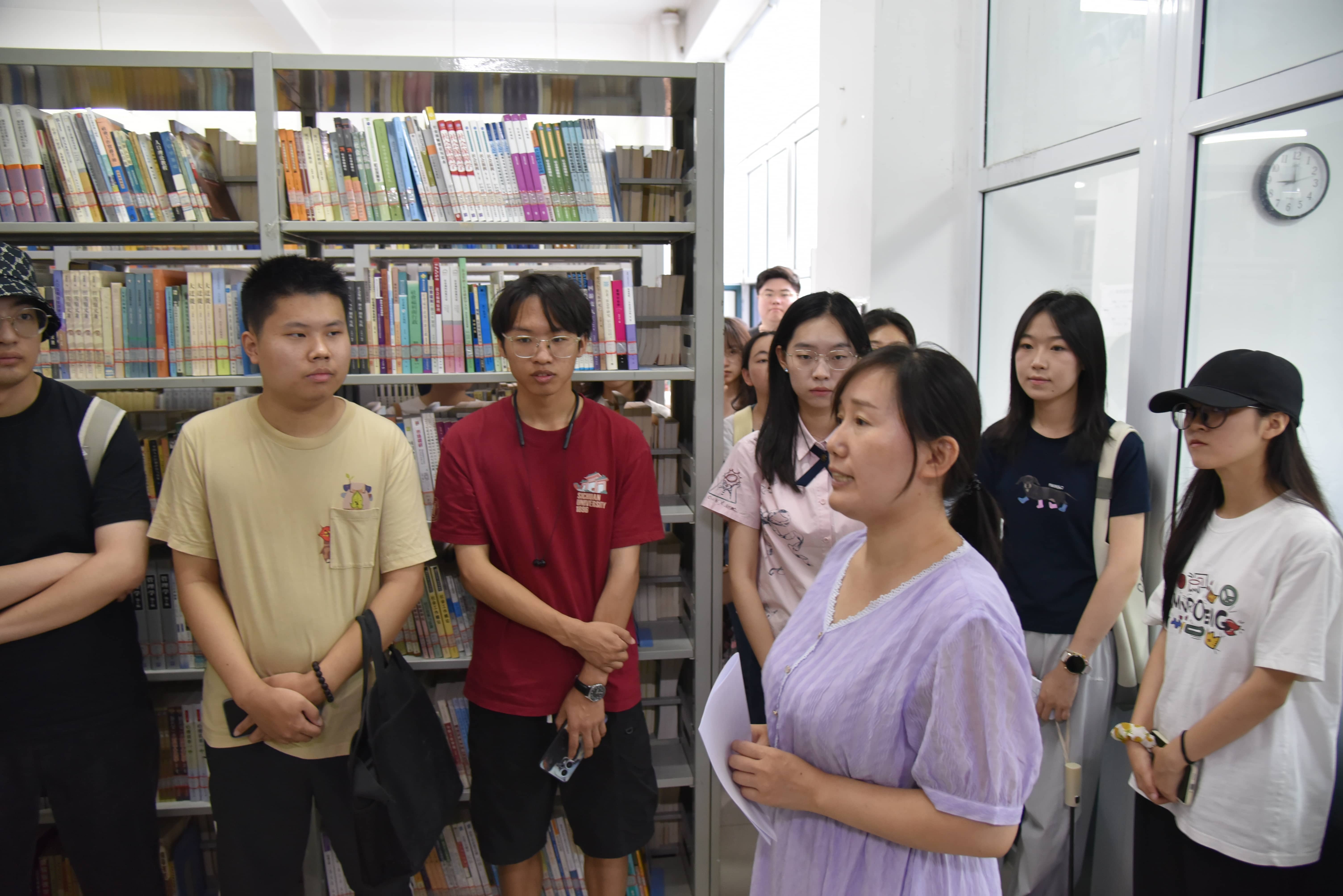 (崔爱红老师在向同学们介绍学院资料室和中心资料室的藏书情况)