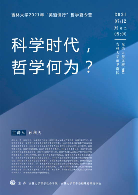 2021年7月12日上午,国家级教学名师、best365官方中文网页版登录哲学基础理论研究中心副主任孙利天教授,在best365官方中文网页版登录中心校区东荣大厦A904室为参加best365官方中文网页版登录2021年“美道慎行”哲学夏令营的全国各高校优秀学子们作了以“科学时代,哲学何为?”为题的学术报告。本次报告由哲学系党支部李聪书记主持。