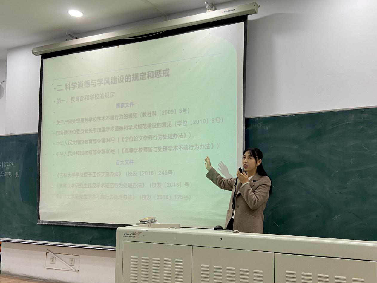 其次,蒲新微教授向同学们解释了第二个问题,即如何理解科学道德与学风建设的重要性。她提出在科学研究中,同学们不仅要注重学术成果的数量,更要注重学术成果的质量,同学们应避免急于求成的心态和浮躁心理,要踏踏实实做学问,理性的看待学术研究问题并把握自身不被外部商业环境所影响。由此,蒲新微教授为同学们强调了学术研究的行为规范,指出同学们应在科学研究、论文撰写、成果发布等学术活动时实事求是,求真务实。她用一个个案例为同学们解释了一旦发生学术不端行为,其负面影响将伴随人的一生。